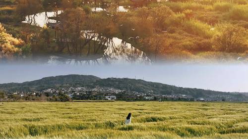 一不小心闯入秋天的调色盘——金黄稻田铺作底,绚烂花海泼上彩,连风都裹着斑斓。